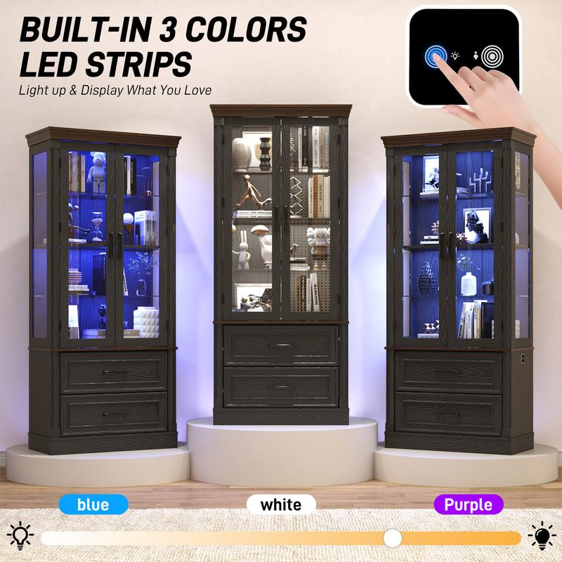 71" Tall Display Cabinet with Glass Doors, 4-Tier Lighted Curio Cabinets with 2 Storage Drawers and Metal Handle for Living Room, Home, Kitchen, White/Brown