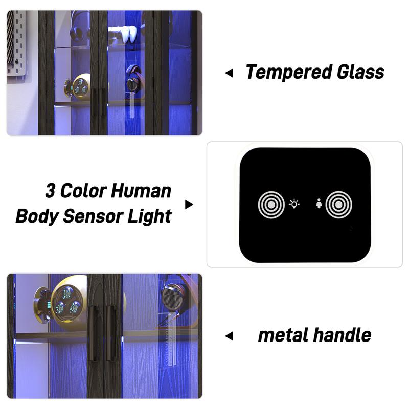 - Display Cabinet with LED Lights:This white curio cabinet features two LED light strips which have 3 adjustable modes (blue, yellow and white), adjustable brightness and body sensor button (The light will turn on when sensors a person within 1-2 meters).