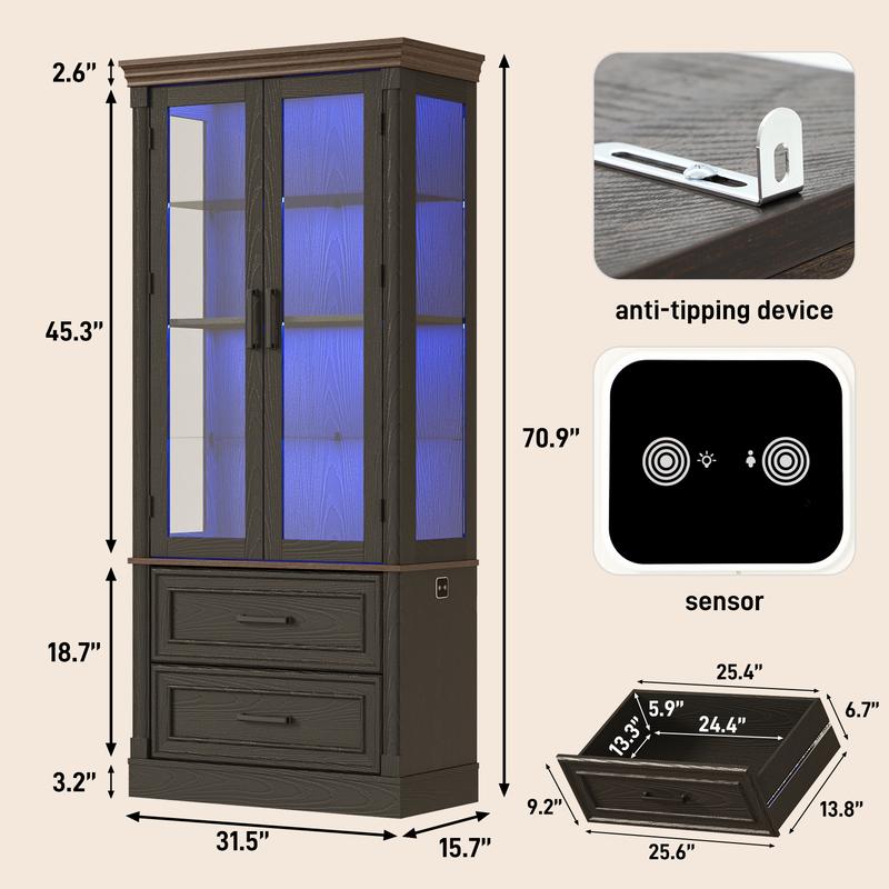 - Large Glass Display Case:Dimensions: 31.5''L x 15.7''W x 70.9''H, our bookcase cabinet with two removable glass compartments and one fixed shelf to meet your daily use. Drawer sized at 25.6"L x 13.8"W x 9.2"H, provide extra place for towels, dolls, beautiful tableware, books, and trophies.