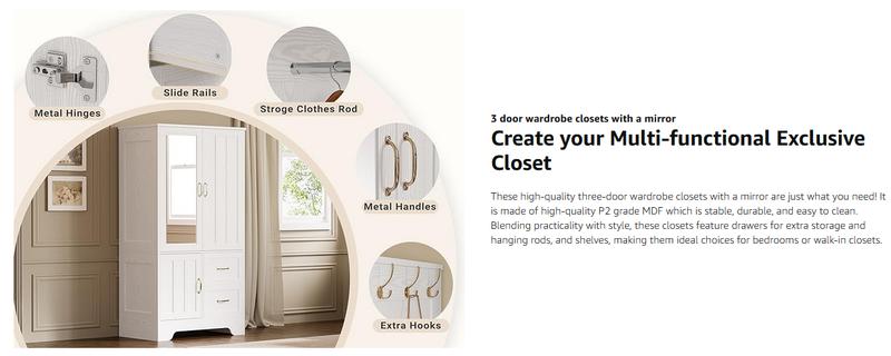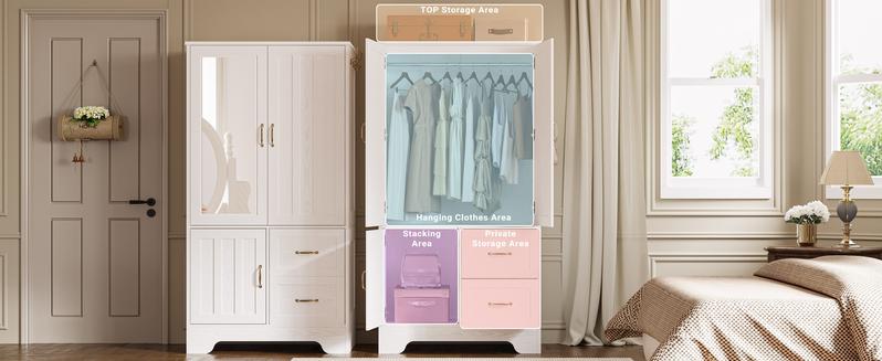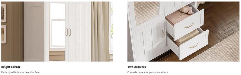 - Durable and Sturdy: The bedroom wardrobe armoire is made of high-quality MDF wood, and the anti-tip device ensures stability and durability. It is also waterproof and scratch-resistant and consists of durable drawer slides and clear mirrors for long-term use
