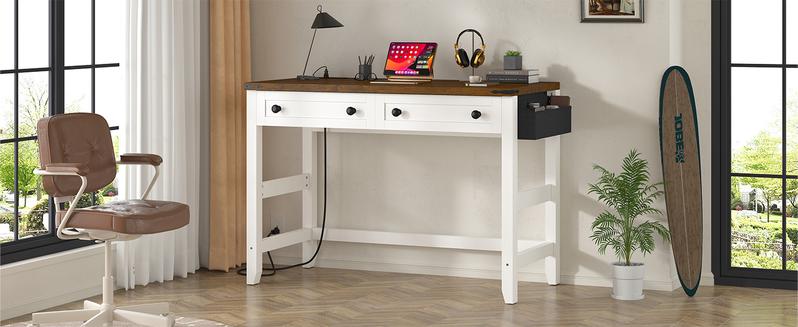 Raybeefurniture Wood Computer Desk, Small Desk with Power Outlet, Home Office Desks, Study Desks with Storage Bag for Bedroom,Home Office Gaming